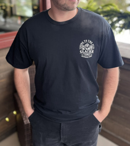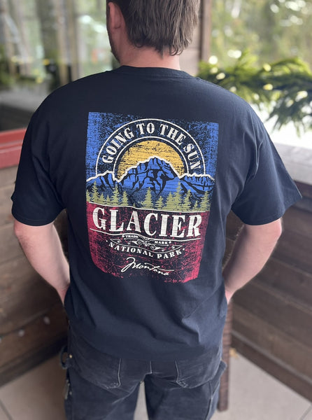 Cotton tee with design on left chest and a colorful full design on back of shirt.